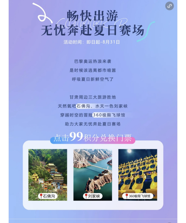 首期活動,運營集團精選蘭州石佛溝國家森林公園(國家AAAA級旅游景區(qū))、劉家峽恐龍國家地質(zhì)公園(國家AAAA級旅游景區(qū))及蘭山360極限飛球三家景區(qū)場館參與活動。期間,吾悅廣場室內(nèi)外大屏也將滾動播放景區(qū)場館的宣傳影片,供廣大消費者了解景區(qū)場館詳細信息。后續(xù),運營集團將根據(jù)市場反饋與實際情況,不斷調(diào)整、更新活動場館,為廣大消費者帶來更加豐富多元、新鮮有趣的旅游體驗。