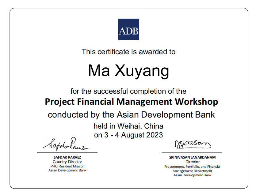 此次培訓(xùn)重點(diǎn)對(duì)亞行采購政策、合同管理與合同計(jì)劃、亞行財(cái)務(wù)盡職分析要求、項(xiàng)目會(huì)計(jì)核算、項(xiàng)目財(cái)務(wù)報(bào)表、項(xiàng)目審計(jì)等主題進(jìn)行授課。通過演講、案例研究、小組討論、結(jié)業(yè)測試及經(jīng)驗(yàn)豐富的執(zhí)行機(jī)構(gòu)分享經(jīng)驗(yàn)等方式使參訓(xùn)人員加深了解亞行貸款采購、財(cái)務(wù)政策/規(guī)定并拓展實(shí)踐知識(shí)。甘肅文旅集團(tuán)國際金融組織貸款項(xiàng)目管理辦公室一名同志代表亞行貸款甘肅環(huán)境可持續(xù)鄉(xiāng)村振興與發(fā)展項(xiàng)目作了大會(huì)交流發(fā)言,分享了項(xiàng)目管理工作中的經(jīng)驗(yàn)和關(guān)注點(diǎn)。培訓(xùn)授課結(jié)束,三名參訓(xùn)人員獲得了結(jié)業(yè)證書。